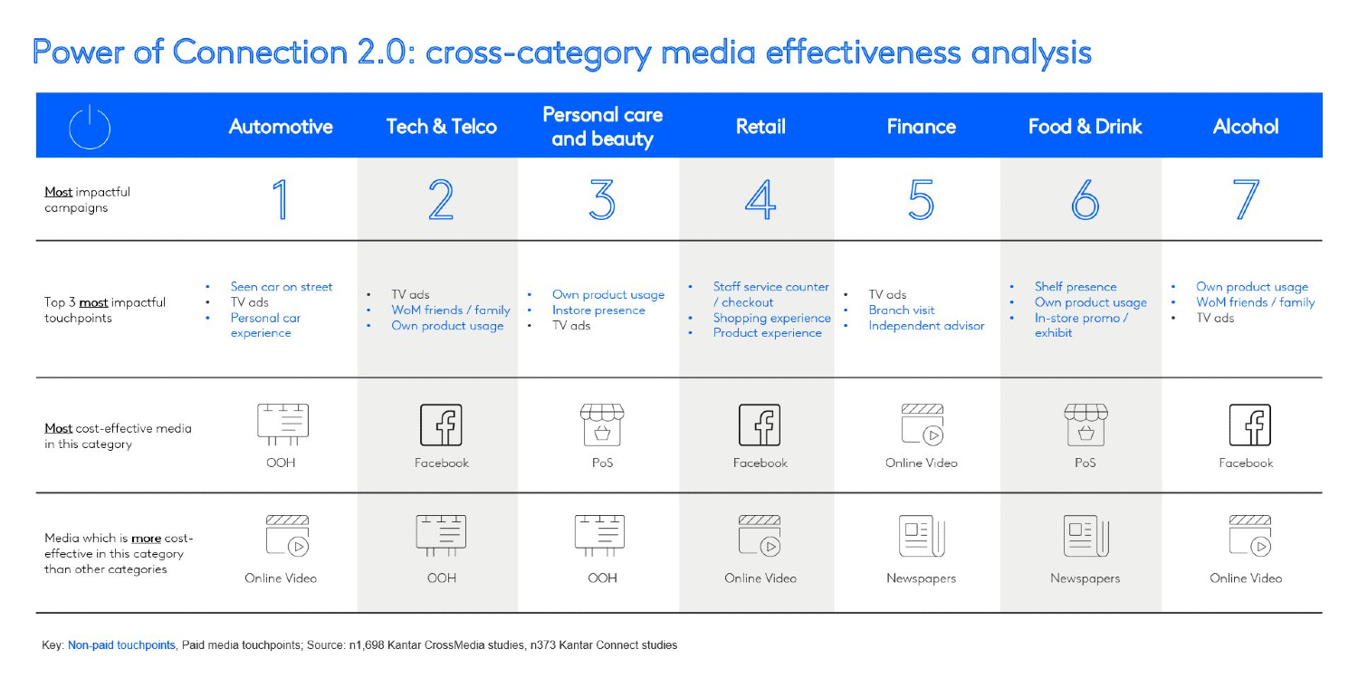 The 20:80 rule based on learning from the Kantar Connect database says that 20% of touchpoints typically create 80% of total brand impact. Less is generally more; however, the most impactful touchpoints differ significantly per category. For instance, TV is among the top 3 most influential touchpoints for most categories, but is less important for Retail brands. Print advertising is among the most impactful touchpoints for Food & Drink, Finance, and Personal Care & Beauty, but isn’t as important for other categories. This means there isn’t a one-size-fits-all solution when it comes to the perfect touchpoint mix, and each brand needs to identify what works best for their category and country, as well as their own positioning and competitive situation.