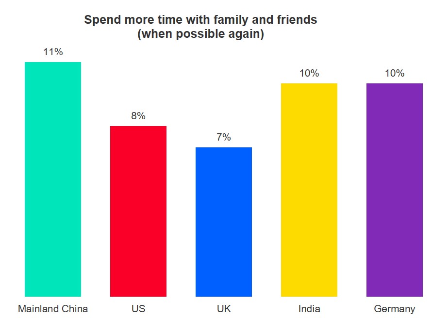 UK respondents show more inclination to travel (11%) than to see family and friends (7%). US respondents favour seeing family and friends (8%) over travel (7%).