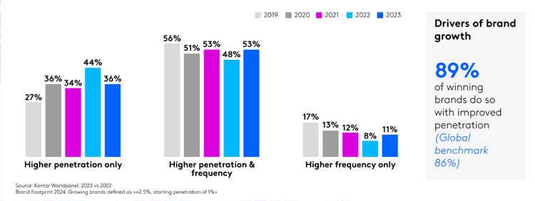 A remarkable 89% of all brands that grew in the last year did so by gaining penetration. In 2023, more than half (53%) of the brands that increased their CRPs in Asia combined greater penetration with increased purchase frequency. Improving penetration alone was successful for 36%, while only 11% grew by upping frequency.