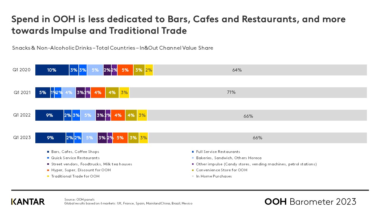 In beverages – coffee, soft drinks and water – the gap between OOH and in-home spend is even more marked, with 34% coming from OOH, compared with 36% before the pandemic.