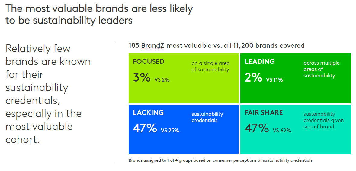 To get a sense of how the biggest, most valuable brands in the world are perceived to be doing on sustainability, we devised a brand segmentation. We identified brands that are seen as leading, focused, have their fair share or are seen as lacking in sustainability. Interestingly, relatively few brands are known for their sustainability credentials, especially in the most valuable brand cohort, where currently only 2% of them are seen as leading, versus 11% in the wider BrandZ database of over 11,000 brands.