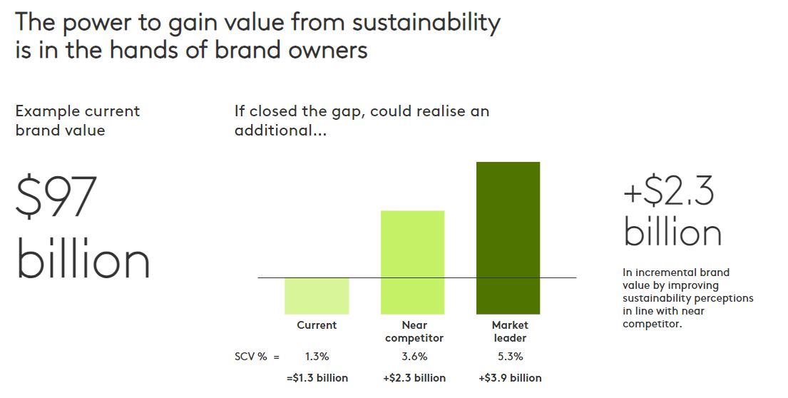 This shows there is a lot of value left on the table by brands not taking action and an enormous opportunity to do good for people, the planet and business. Let’s look at an example here of the total value of a brand in the BrandZ global top 100, $97 billion. The current sustainability contribution to value for that brand is 1.3%. If this brand were to increase sustainability contribution to value in line with the near competitor, it would add $2.3 billion to its brand value.