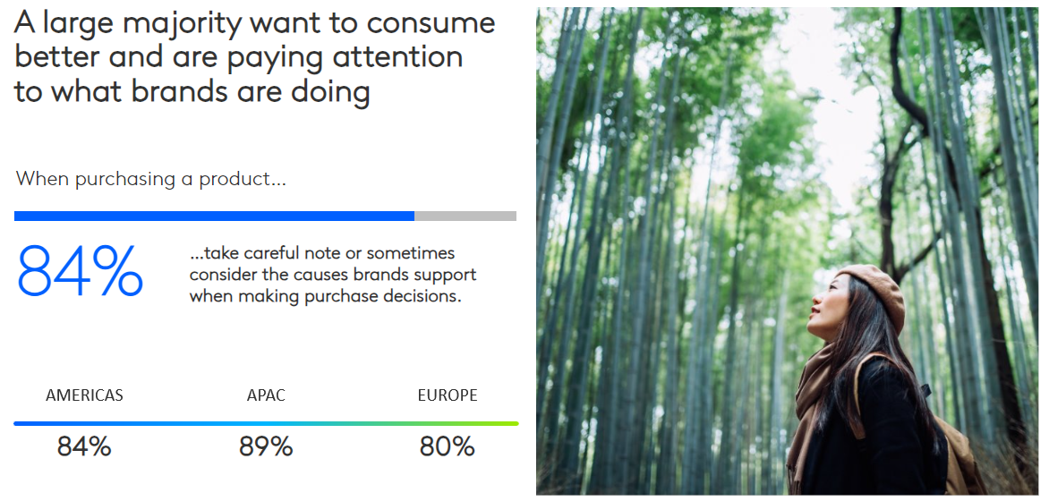 There's evidence from around the world that many consumers want to consume better and are paying attention to what brands are doing. 84% of people globally said they take careful note of, or sometimes consider, the causes brands support, when making purchase decisions. Kantar’s Global Monitor shows that 80% of global consumers like it when companies make it clear what they stand for and stay true to their values.