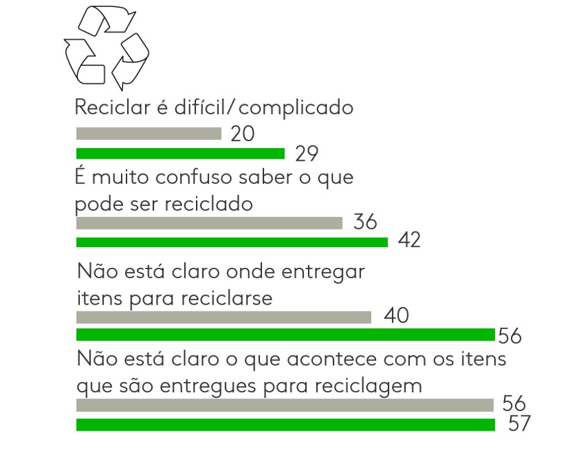 Outra descoberta é que educar o comprador se torna uma estratégia importante. Observamos que os conceitos ambientais não são claros para o consumidor, como a reciclagem: 57% dos consumidores latinos não têm certeza do que acontece com os itens que são entregues para reciclagem.
