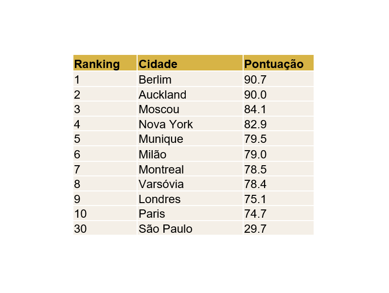 Berlim é líder mundial em mobilidade urbana, de acordo com o estudo Mobility Futures da Kantar. A capital alemã está no topo devido às suas viagens econômicas e facilidade de acesso a uma ampla variedade de infraestrutura de transporte público e serviços de compartilhamento de viagens. Por outro lado, devido à infraestrutura pública limitada, São Paulo ficou em penúltimo lugar no ranking de 31 cidades, vencendo apenas de Nairóbi, capital do Quênia.