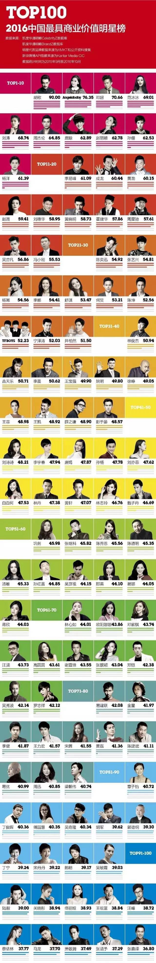 Among the top 100 celebrities, 71 are from the Chinese mainland, 29 from either Hong Kong or Taiwan. Male stars occupied 60% of the ranking. The average age for female celebrities is 35.7 and while that for male celebrities is 40.