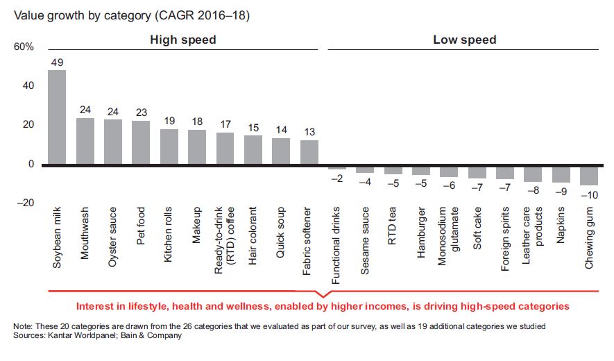 In fact, RTD coffee landed among the top 10 high-speed categories, along with soybean milk, mouthwash, oyster sauce, pet food, kitchen rolls, makeup, hair colorant, quick soup and fabric softener. All of these categories have been propelled by consumers’ interest in improving their lifestyle, health and wellness, a passion enabled by higher incomes. The top 10 low-speed categories include chewing gum, monosodium glutamate, soft cake, hamburger and other categories that are not marketed with the promise of healthier living.