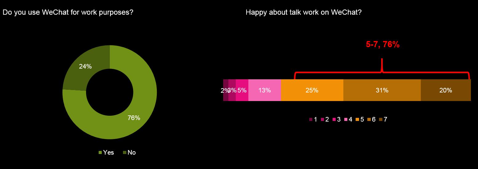 • Even though WeChat is a personal social media platform, 76% users are using it for work purpose, and 76% of them felt more or less happy with this fact;
