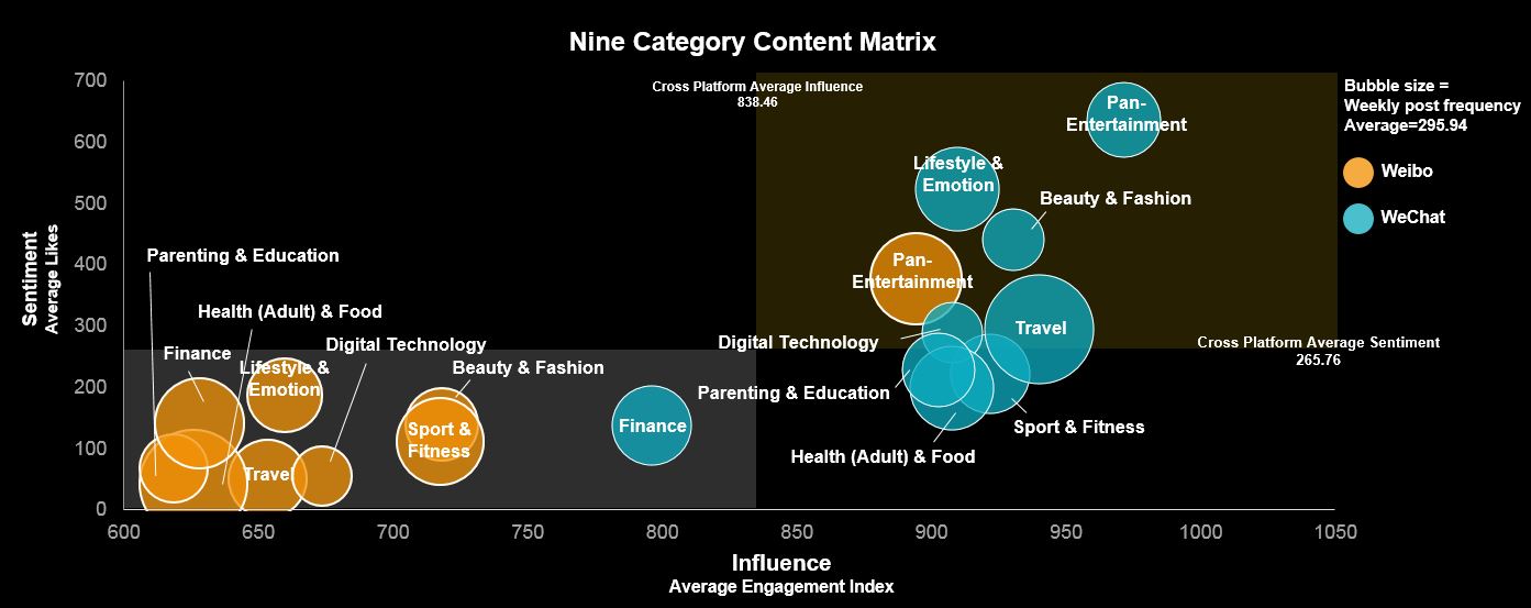 Even the categories’ performances on Weibo and WeChat are very different: only entertainment KOLs from Weibo had more engagement and likes than average, while most KOLs on WeChat have performed above average, except those from financial category.