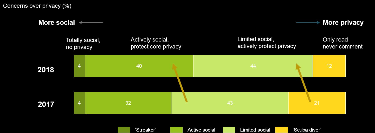 • Compared with last year, people are more comfortable to say something rather than be silent to protect privacy: only 12% social media users will remain totally silent, compared with 21% in 2017. There is an 8 percentage point increase in the proportion of “actively social and protect key privacy” user group (40% vs 32%). However, the proportion of zero-privacy protection group remains the same at 4%;