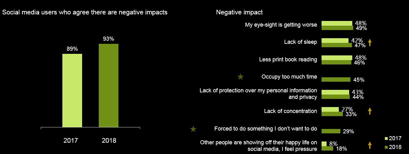 • As in the previous four years, “less book reading” had remained No.1 negative impact. In 2018 two health-related concerns - “eye-sights getting worse” (49%) and “less sleep” (47%) – moved to the top of negative impact ranking.