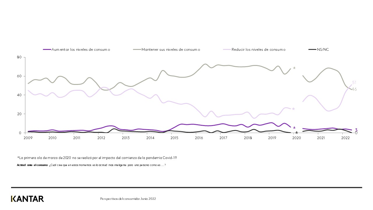 Según la segunda edición de 2022 del Informe Perspectivas del Consumidor de Kantar, que de manera trimestral analiza la confianza del consumidor español en torno a la economía propia y del país, este periodo se ha registrado un incremento de la idea de que es mejor reducir los niveles de consumo. Así, los consumidores se muestran divididos entre mantener sus niveles de consumo (46%) y reducirlos (51%) siendo la primera vez desde 2012 en la que los consumidores más favorables a reducir superan a los que prefieren mantener el consumo.