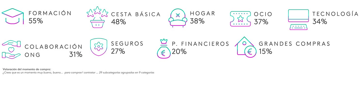 El consumidor nos traslada una ligera mejora en la valoración del momento de compra en todas las categorías propuestas, aunque el valor de la categoría resulta un factor determinante. De esta manera, formación y productos básicos son las categorías que lideran el ranking, mientras que las inversiones financieras y los bienes inmuebles se posicionan a la cola. A pesar de ello, productos financieros es una de las categorías que más incrementa su atractivo gracias, probablemente, a las buenas rentabilidades obtenidas por los mercados financieros: un 20% de los españoles cree que es buen momento para adquirir este tipo de productos.