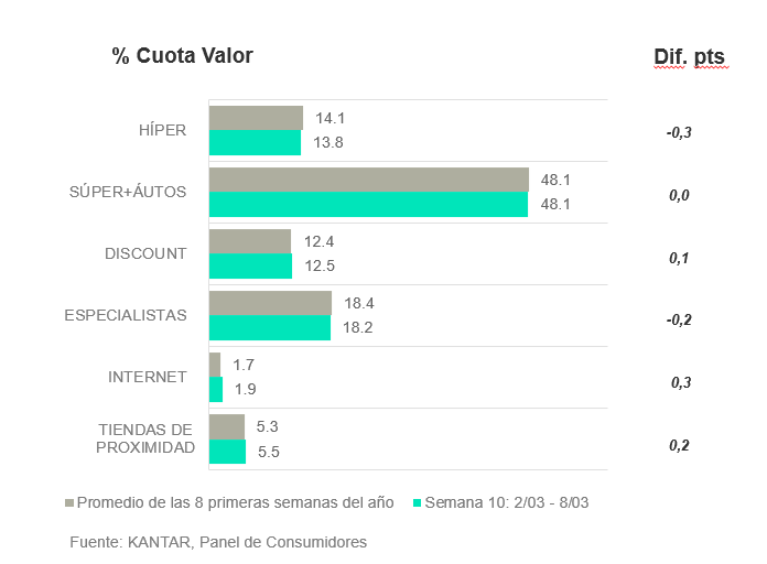 Por canales, el mayor consumo se continúa apreciando en el canal online y tiendas de proximidad, creciendo en valor 0,3 y 0,2 puntos respectivamente, respecto al promedio de las ocho primeras semanas del año. El canal online además consigue atraer un 2,7% de los hogares españoles (+11%) y con un ticket todavía mayor (+17%) al que suelen hacer de forma habitual.