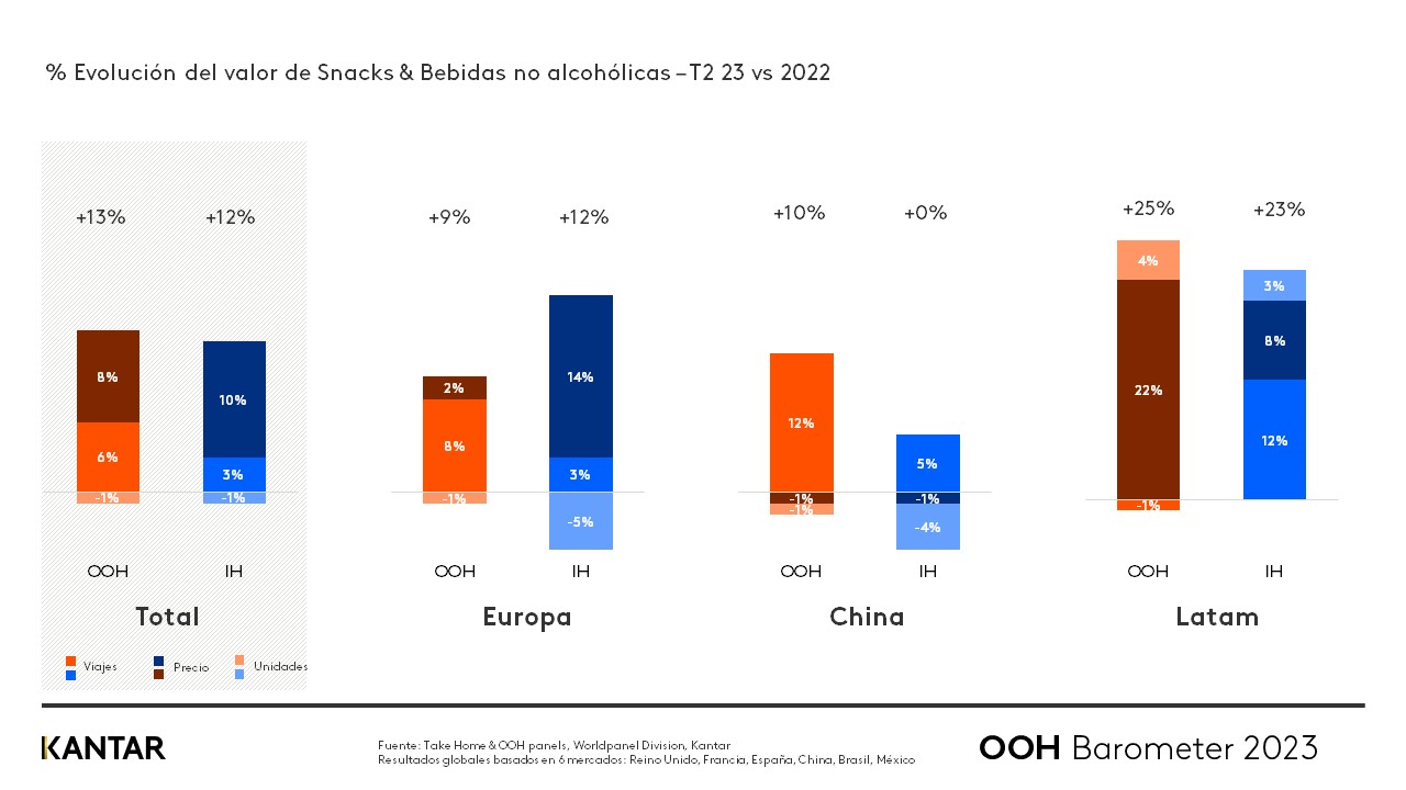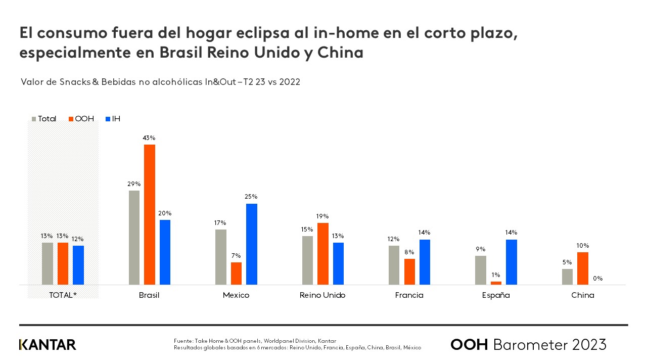 El consumo sigue caminando poco a poco hacia la etapa anterior a la pandemia. De hecho, las ventas de snacks y bebidas sin alcohol dentro y fuera del hogar crecieron un 13% en el segundo trimestre de 2023, según el Barómetro OOH 2023 de Kantar Worldpanel, que ha registrado los datos de seis mercados representativos en el mundo (España, Francia, Reino Unido, México, Brasil y China) para extraer conclusiones sobre las actuales tendencias de consumo fuera y dentro del hogar.
