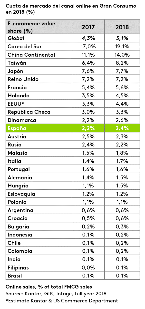 La compra online de productos de gran consumo ha crecido un 9,1% en España en el último año, según los últimos datos de la consultora Kantar sobre e-commerce. Con este incremento, el comercio electrónico ya representa un 2,4% del mercado español de gran consumo, frente al 2,2% del año 2017.