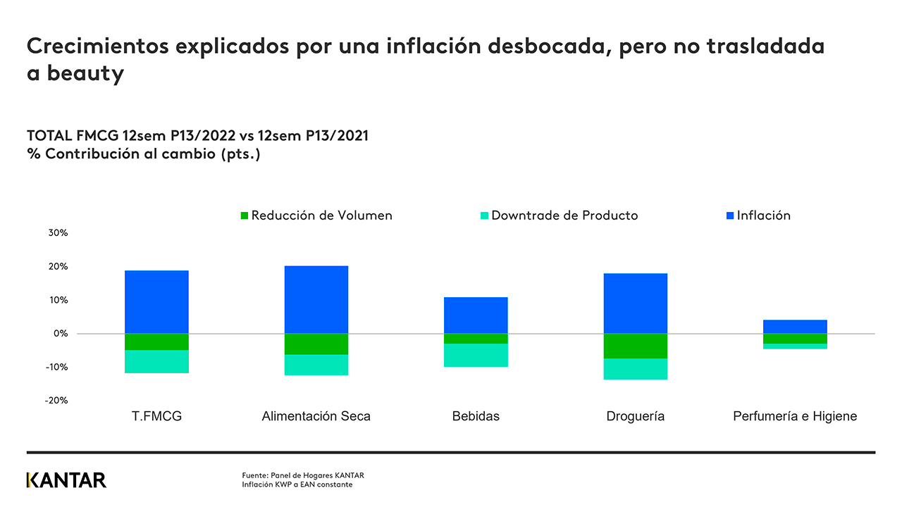 A pesar de que la inflación no se ha trasladado al Beauty, la subida en el precio de los productos ha sido propiciada por cestas con más categorías de belleza que de higiene, lo que ha hecho encarecer la compra por el mix de productos seleccionado. No obstante, los productos de belleza adquiridos son de menor valor, según los datos compartidos por Kantar Worldpanel.