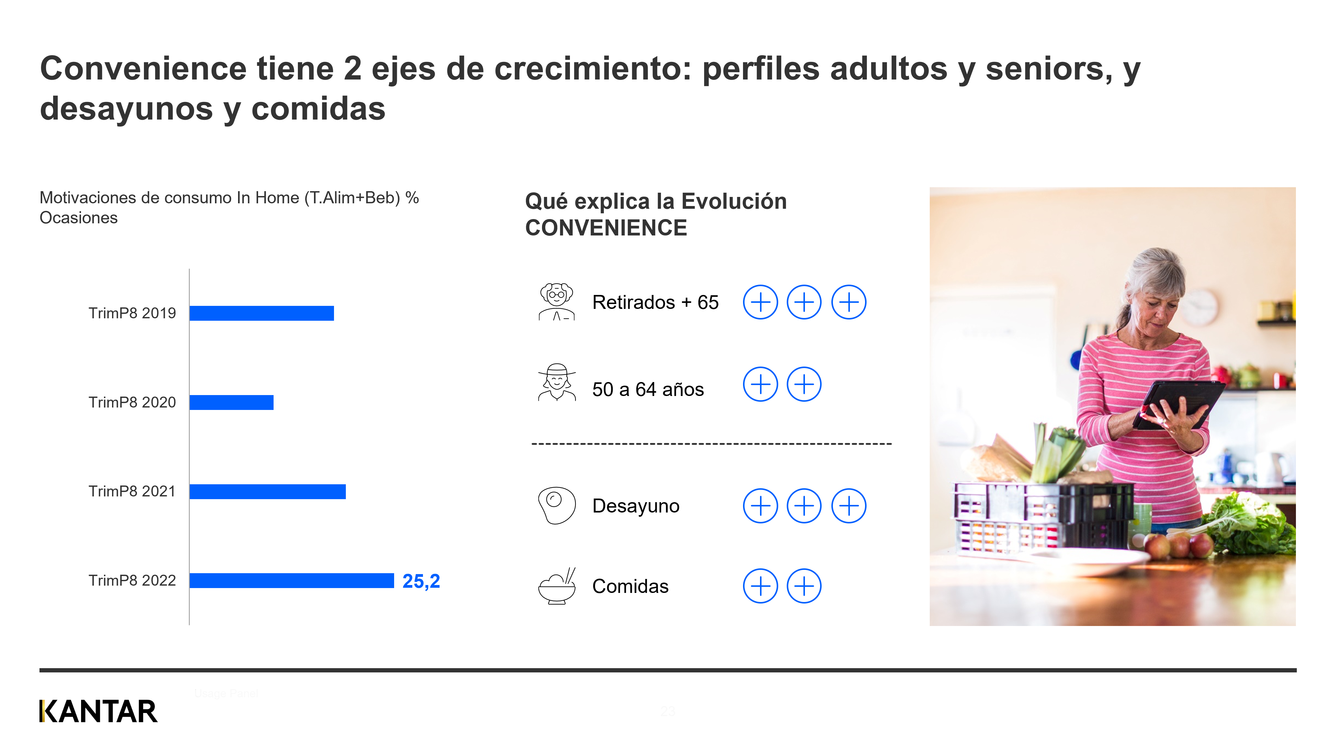 El porcentaje de consumidores que usa ingredientes pre-elaborados que le ayuden a ahorrar tiempo cocinando va en aumento y la mitad de los encuestados están dispuestos a pagar más por productos que les hagan la vida más fácil. Esta tendencia, llamada convenience, tiene dos ejes de crecimiento: perfiles adultos y seniors (que no empezaron siendo el target), por un lado, y desayunos y comidas, por el otro. Tal y como pronosticamos, el convenience ganará importancia en todo tipo de hogares y ocasiones y será vital que distribuidores y fabricantes cubran esta necesidad a través de la innovación, la facilidad en la compra y nuevos formatos. Y es que adaptarse a las necesidades de ahorro de tiempo también pasa por formatos más pequeños o raciones individuales, tendencia que empezará a adquirir más importancia en adelante. Actualmente, el 27% de las ocasiones de consumo a la semana las hacemos solos y las previsiones indican que para 2035 casi 3 de cada 10 de los clientes vivirán solos en casa.