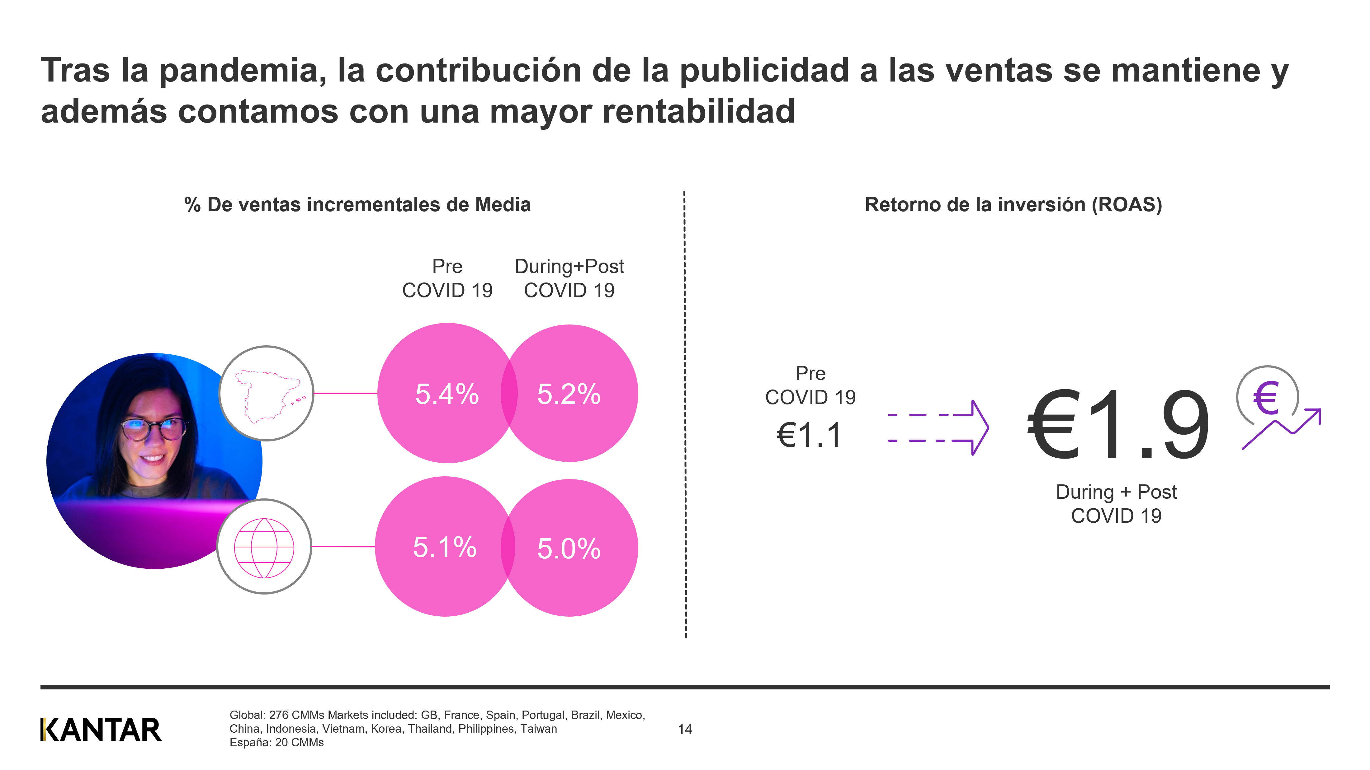 No obstante, y a pesar de la complejidad del momento, hay marcas que logran crecer gracias a realizar distintas acciones de marketing, destacando, sobre todo, su inversión en medios para acompañarlas. Esto es lo que, en Kantar, consultora líder en paneles de consumo, hemos analizado en la última sesión Dibujando el futuro de la eficiencia de Medios, donde se hemos abordado cómo, tras la pandemia, la contribución de la publicidad a las ventas de las marcas no solo se mantiene, sino que, además, consigue una mayor rentabilidad.
