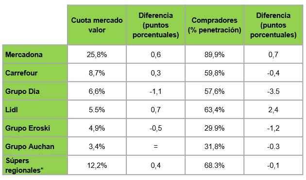 Por su parte, Auchan (3,4%) cierra el TOP 6 manteniendo su cuota estable y frenando de forma definitiva sus caídas, mientras continúa su proceso de aunar sus marcas bajo el nombre Alcampo, cerrando las tiendas menos rentables, y renovando gran parte de su marca propia, en un esfuerzo por recuperar la imagen y el peso que la enseña llegó a tener en España.