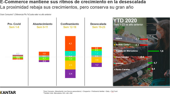 A pesar de que estamos en un escenario en el que prácticamente todos los actores son ganadores, cabe destacar el excelente comportamiento del e-commerce, que mantiene sus ritmos de crecimiento y aumenta su cuota en un 0,7%.