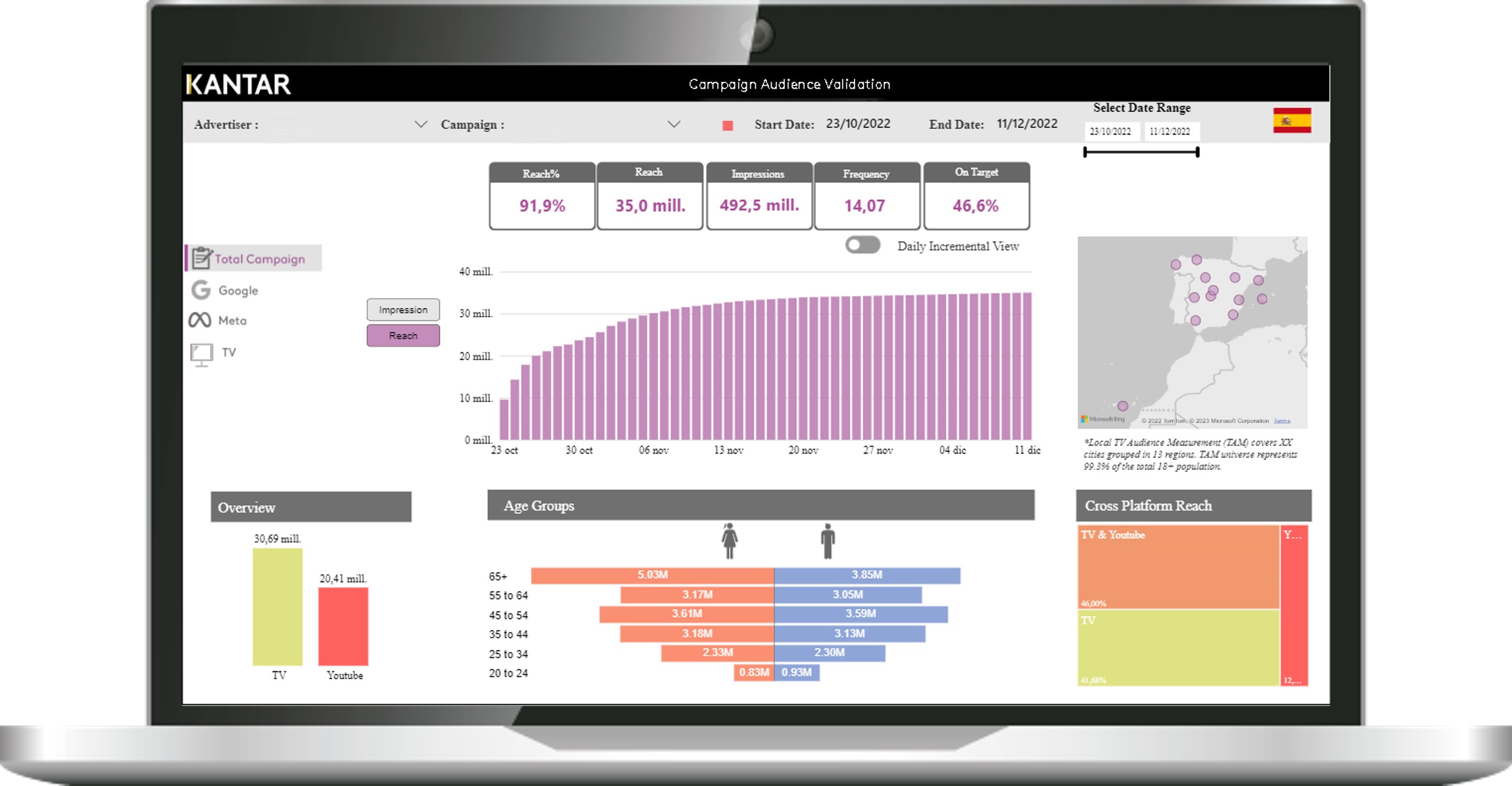 La solución ofrece una visión unificada del público objetivo, validando la audiencia de la campaña y permitiendo un mayor control de estas, evaluando las estrategias con insights in-flight (sobre la marcha) para la optimización de la cobertura y frecuencia mientras la campaña está aún activa.