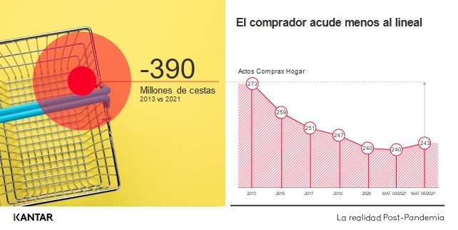 El principal cambio, que ya venía produciéndose pero que la pandemia ha precipitado, es el hecho de que los españoles vayan un número menor de veces a la compra: 390 millones de cestas menos al año, comparando datos de 2013 con 2021. Este cambio, de gran impacto tanto para fabricantes como para distribuidores, está causado principalmente por el traspaso hacia la distribución organizada, el desarrollo del e-commerce y el estilo de vida y la tipología de hogares.
