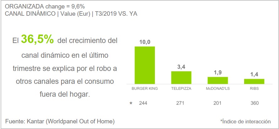 Este aumento en el consumo de comida inmediata del canal dinámico ha afectado directamente a la Restauración. De esta forma, casi cuatro de cada diez ocasiones que gana el ‘Listo para comer’ del supermercado las conquista a bares y restaurantes, principalmente de restauración organizada (las cadenas) como Burger King, Telepizza, McDonald’s o Ribs, y menos a los restaurantes más tradicionales (gráfico 2).