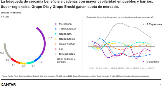 Entre las cadenas beneficiadas por la apuesta por la proximidad, destacan los supermercados regionales, que alcanzan un 18,3% del mercado de gran consumo. Estas cadenas se benefician de su buena localización, en muchos barrios y pueblos. En cada región podemos encontrar ejemplos de cadenas que logran grandes crecimientos durante este periodo, ganando peso en cestas mayores.