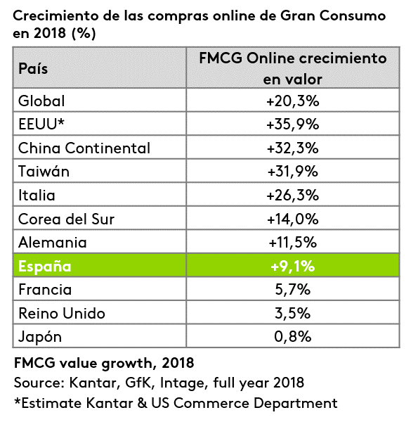 La compra online de productos de gran consumo ha crecido un 9,1% en España en el último año, según los últimos datos de la consultora Kantar sobre e-commerce. Con este incremento, el comercio electrónico ya representa un 2,4% del mercado español de gran consumo, frente al 2,2% del año 2017.
