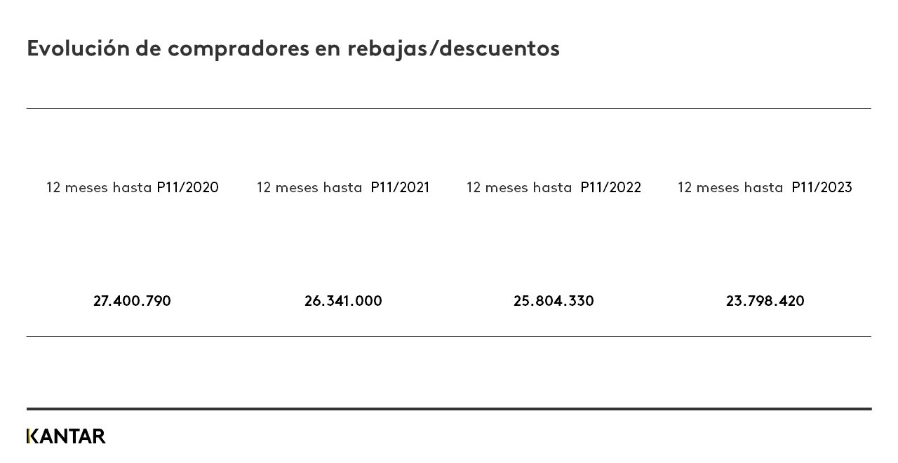 Esta evolución ha venido provocada por una pérdida continua de compradores (textil vestir + accesorios + calzado), lo que ha provocado que durante 2023 más de 1,8 millones de personas dejaran de comprar alguna prenda rebajada.