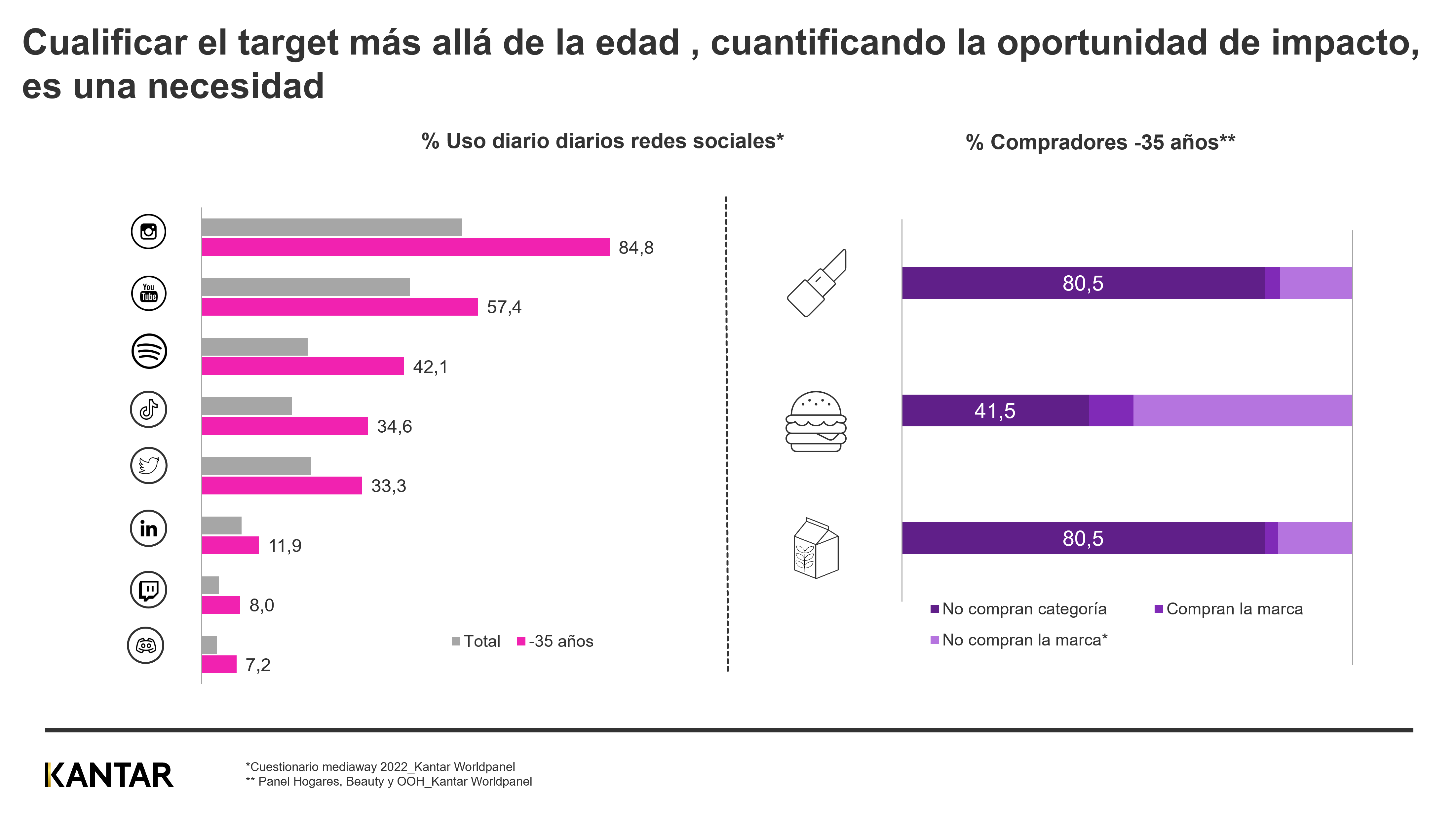 Los españoles siguen pasando muchas horas delante de las pantallas: la televisión, con un 95,3% de penetración, e Internet, con un 92,5%, siguen siendo los dos medios que consiguen llegar a una mayor parte de la población. De hecho, internet es el canal que más aumenta en penetración versus 2019 y el uso diario de las redes sociales crece de forma constante, sobre todo, en los menores de 35. Por ejemplo, algunas de ellas, como Spotify o TikTok, han duplicado su uso diario en esta franja de edad desde 2019. Desde Kantar, apuntamos que la clave para realizar las campañas es cuantificar la oportunidad de impacto, basada en el comportamiento de compra real de este target. Un ejemplo de ello es identificar qué marcas prefieren en determinadas categorías o si, directamente, compran o no una categoría concreta.