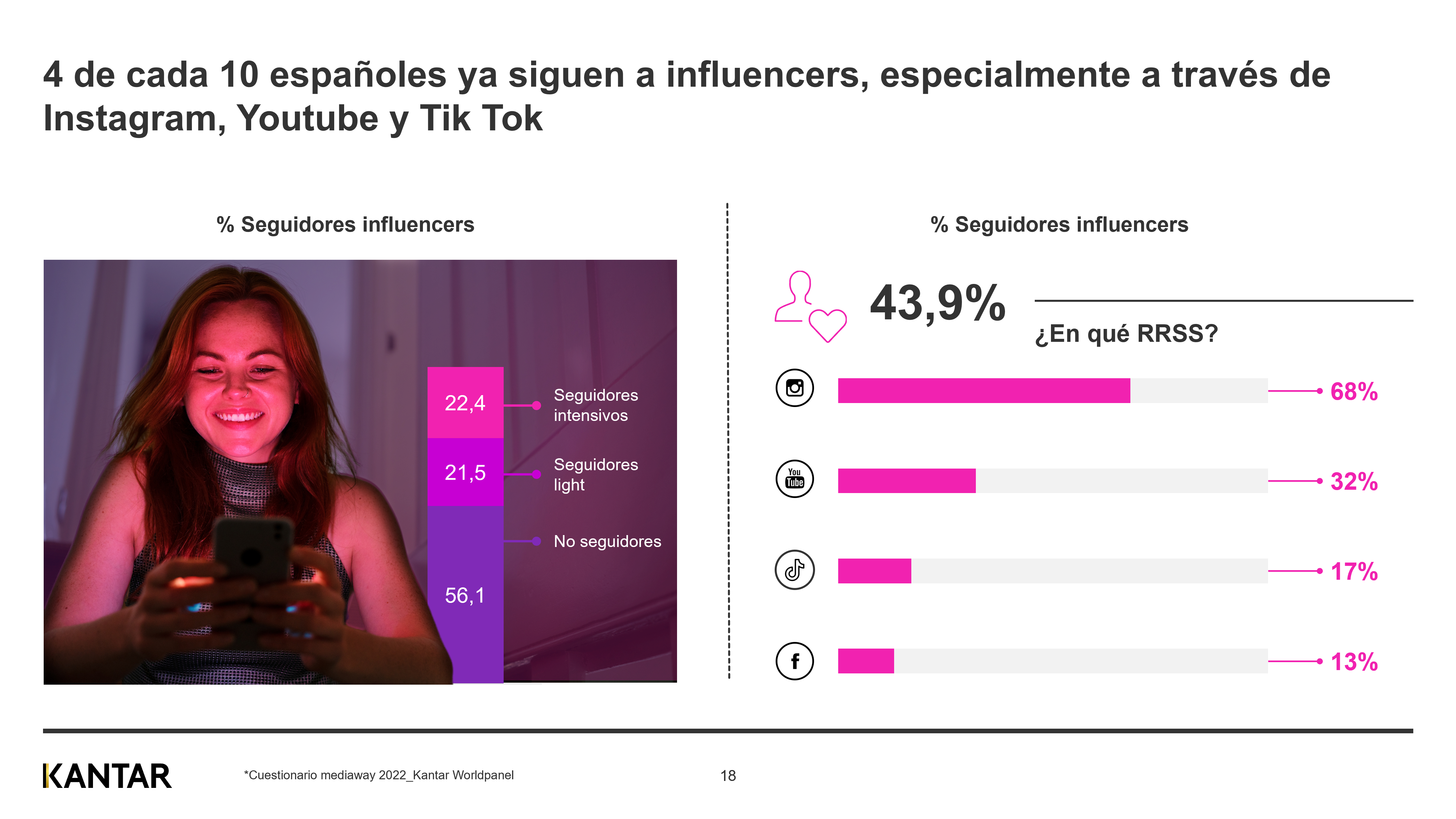 El aumento del consumo de contenido en digital está desencadenando en nuevas oportunidades de comunicación para las marcas, como son el marketing de influencers o las plataformas de streaming. Ambos fenómenos están en auge, tal y como lo demuestran los datos presentados por Kantar. En 2021 la inversión total en influencers por las marcas fue de 93,7 millones de euros, casi 32 millones más que en 2019. Además, un 44% de los españoles ya siguen a perfiles influyentes en redes sociales, y la mitad de estos lo hace de forma intensiva.