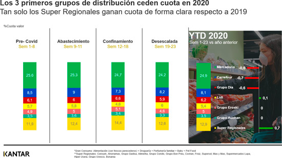 Otra de las consecuencias que nos ha dejado este periodo de crisis, que ha marcado el primer semestre del año, ha sido la cesión de cuota por parte de los tres primeros grupos de distribución −Mercadona, Carrefour y DIA− a otros retailers, lo que ha favorecido al gran crecimiento que han experimentado los supermercados regionales, que son los únicos en ganar cuota de forma clara respecto a 2019, con un incremento del 0,7%.