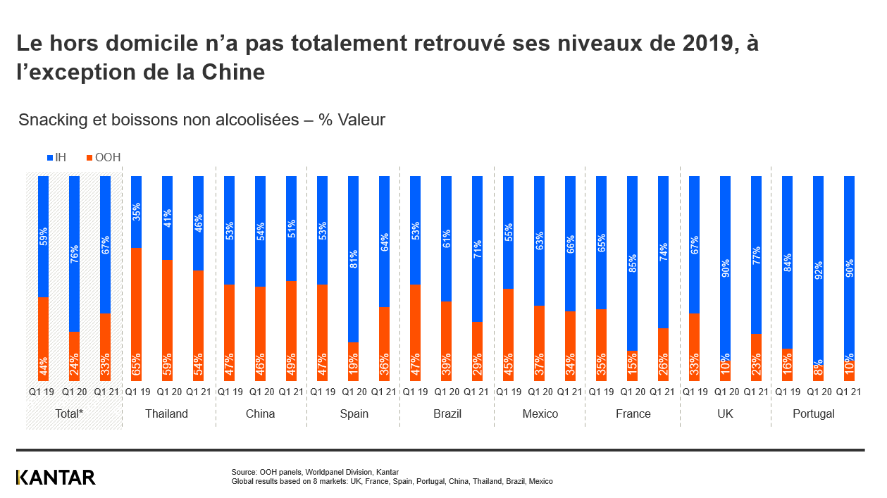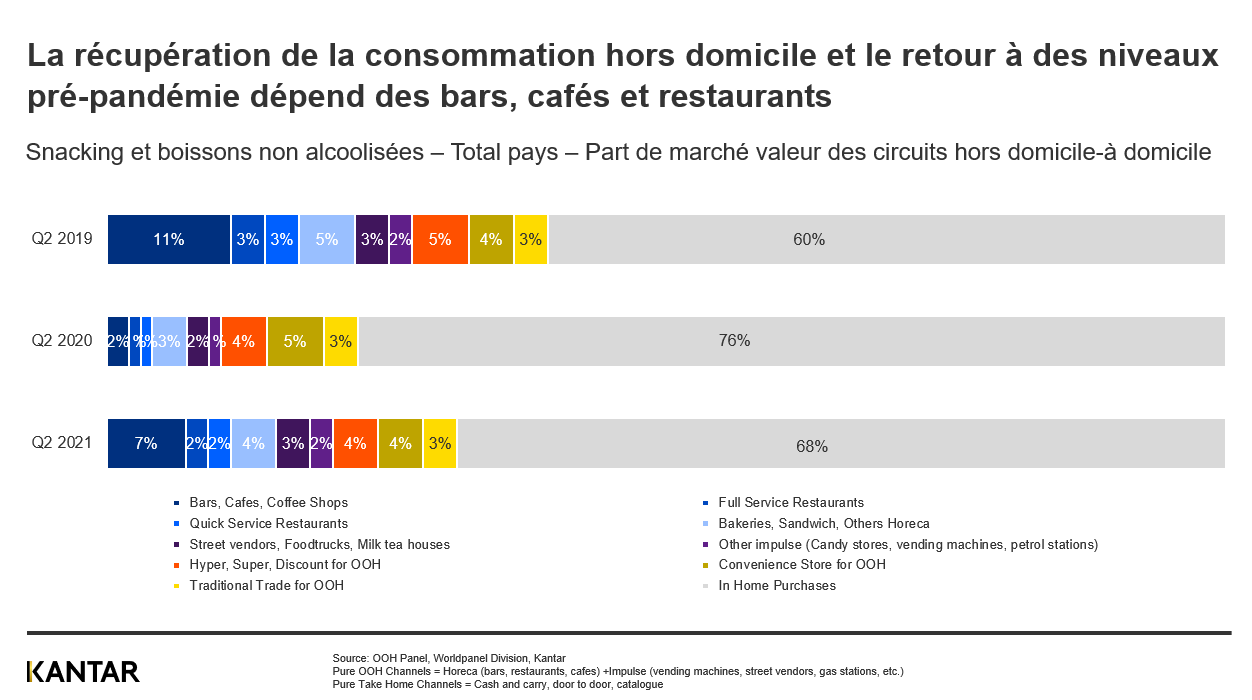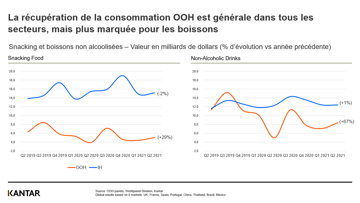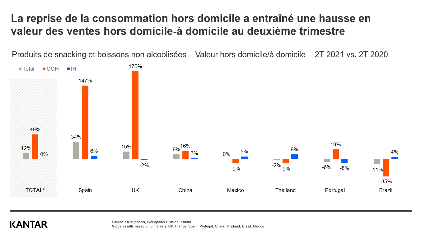 Le retour à une plus grande liberté de consommer à l'extérieur après le confinement a entraîné une hausse des ventes mondiales de produits de snacking et de boissons hors domicile de 49 % (en valeur, T2 2021 par rapport à T2 2020), tandis que la consommation à domicile affiche les mêmes chiffres que pendant le confinement.