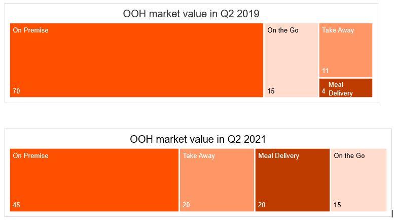 Kantar, société de consulting leader mondial des analyses consommateur, publie de nouvelles données qui révèlent la façon dont la pandémie a impacté les comportements d’achats des consommateurs. Les enseignements de cette étude montrent que les dépenses en Restauration Hors Domicile dans 3 marchés clés (UK, France, Espagne) ont plus que doublé sur le 2e trimestre 2021 comparé à la même période en 2020 – mais restent encore à 75% des niveaux enregistrés en 2019 (et même à 62% en France, toujours impactée par les restrictions administratives sur le 2ème trimestre). Par ailleurs, les livraisons de repas ont progressé de 150% au moment du déjeuner et du dîner.