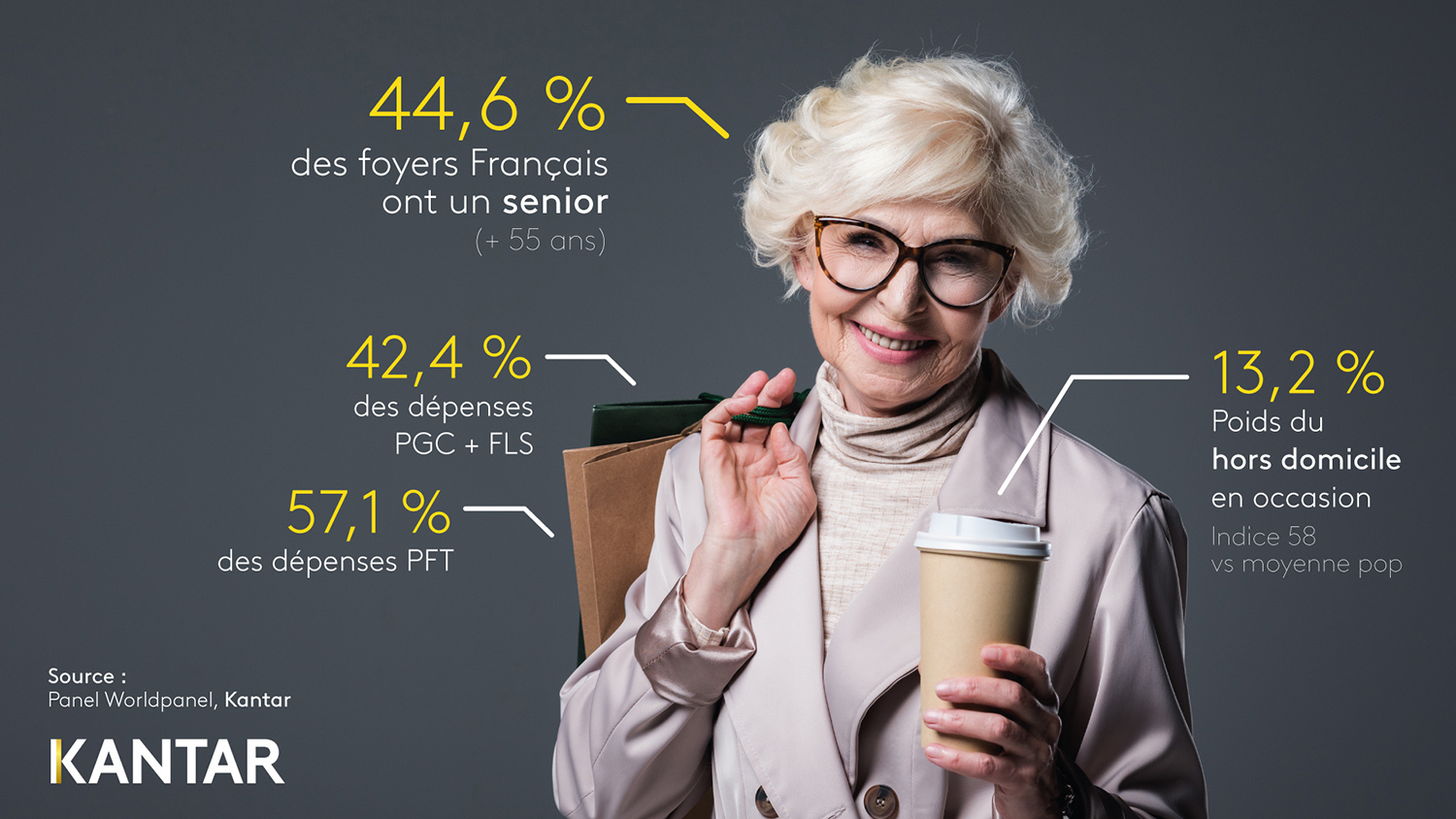 Si les plus jeunes générations (Millennials et Gen Z) suscitent l’intérêt des marques, étant prédictives d’un nouveau paradigme de consommation pour les 30 prochaines années, les seniors et plus particulièrement la génération des Boomers sont largement sous-exploités. C’est en effet aujourd’hui, près de 28 % des ménages Français qui ont un Baby-boomer à domicile et 15 % un Silencieux (70 ans et +). Ces deux tranches d’âge représentent en 2021 respectivement 28 % et 15 % des dépenses sur les PGC+FLS et 33 % et 24 % des dépenses en produits frais traditionnels soit la moitié des dépenses en grande consommation.