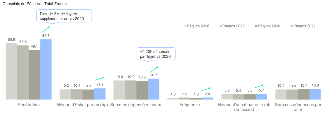 Pâques 2021 a ainsi vu les achats de chocolats exploser avec + 3 Millions de foyers acheteurs sur la période vs 2020 et + 2,20 € dépensés par foyer.