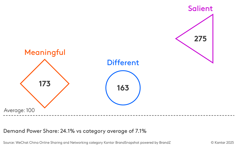 Kantar Marketplace’s BrandSnapshot confirms the strong connection Chinese consumers have with WeChat. The brand is hugely Meaningful, Different, and Salient, with Demand Power more than three times the category average in online sharing and networking, up from twice the category average the previous year. Despite being a huge brand, it continues to grow at a healthy pace. The only brand that comes close in Demand Power is Douyin, the Chinese sibling of TikTok. However, Douyin does not offer the same breadth of services as WeChat and, as a result, has a smaller and less diverse user base.