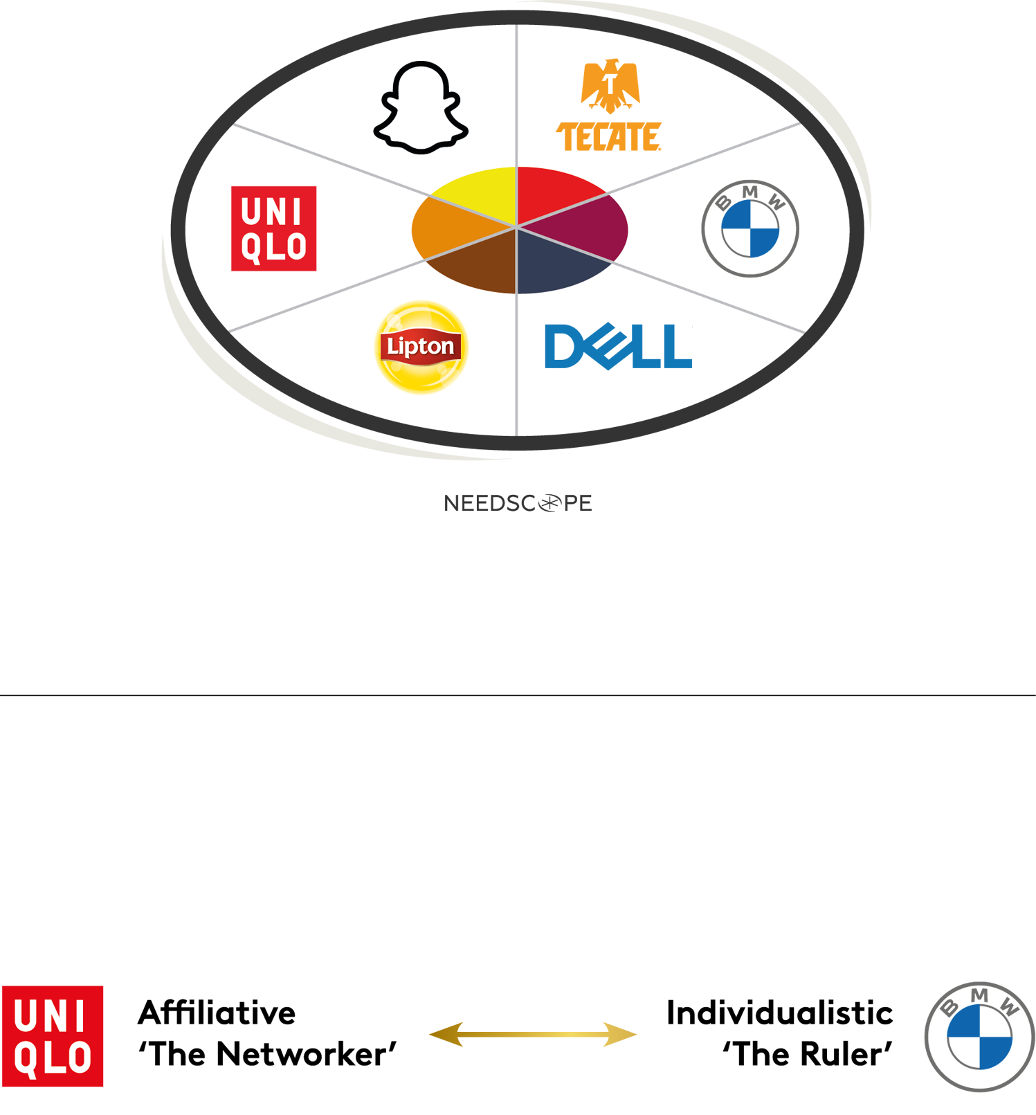 Reading the BrandZ Brand Personality data further we see several brands with a strong link to a different archetype. For example: Tecate Beer is a Rebel; BMW is a Ruler; Dell is a Sage; Lipton Iced Tea is a Caregiver; Uniqlo is a Networker; and Snapchat is a Joker. Through this link, these brands can map to the different spaces in the NeedScope model.