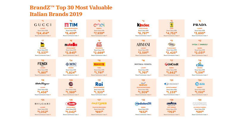 È quanto emerge dalla classifica BrandZTM Top 30 Most Valuable Italian Brands 2019 stilata da WPP e Kantar, secondo cui i marchi italiani hanno aumentato il loro valore del 14% negli ultimi 12 mesi raggiungendo i 96,9 miliardi di dollari, nonostante il clima di incertezza economica e politica.