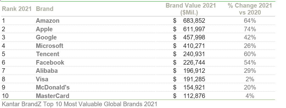 Amazon ha mantenuto la sua posizione di brand di più alto valore al mondo, crescendo del 64% attestandosi a 684 miliardi di dollari (l'equivalente del PIL della Polonia). Entrato per la prima volta nella classifica di BrandZ nel 2006, il valore di Amazon è cresciuto di quasi 268 miliardi di dollari quest'anno ed è diventato il primo brand da mezzo trilione di dollari, raggiunto da Apple che raggiunge i 612 miliardi di dollari di brand value.