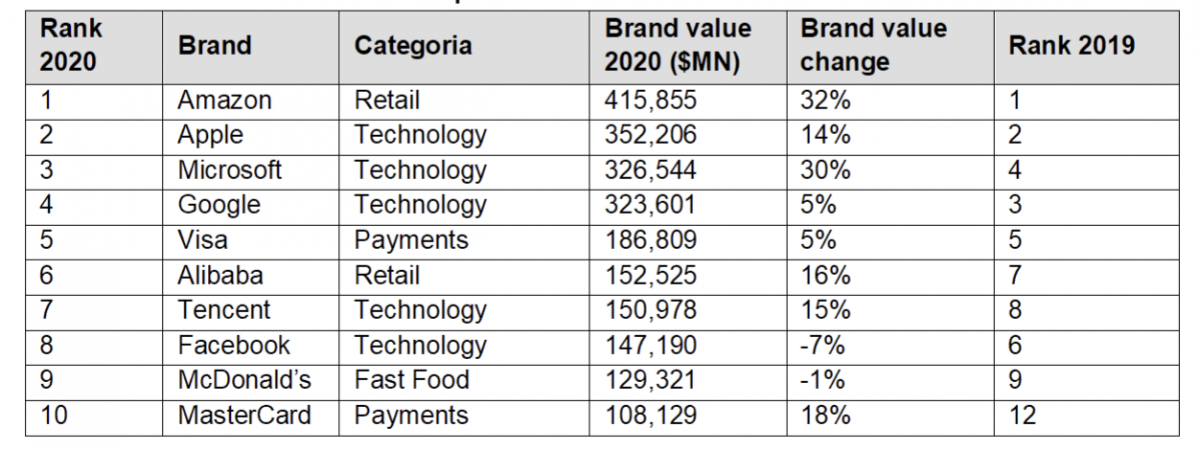 Giunta alla sua quindicesima edizione, la classifica BrandZ ha visto crescere il Brand Value del 5,9%, raggiungendo quasi 5.000 miliardi di dollari - equivalenti al PIL annuo del Giappone - nonostante l'impatto economico, sociale e personale del COVID-19. Amazon ha mantenuto la sua posizione di Brand di più alto valore al mondo, crescendo del 32% e raggiungendo i 415,9 miliardi di dollari. Il suo valore è cresciuto di quasi 100 miliardi di dollari e quest'anno rappresenta un terzo della crescita totale della Top 100.