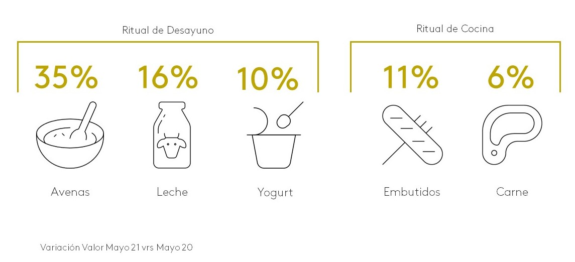 En el ritual de desayuno vemos la tendencia saludable con el aumento de la compra de la categoría de avenas, creciendo junto con leches y yogurt. Mientras en los rituales de cocina, las carnes y embutidos crecen un 7% en promedio.
