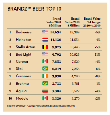 Pero el Beer Top Ten del BrandZ Global 2020 de Kantar es: