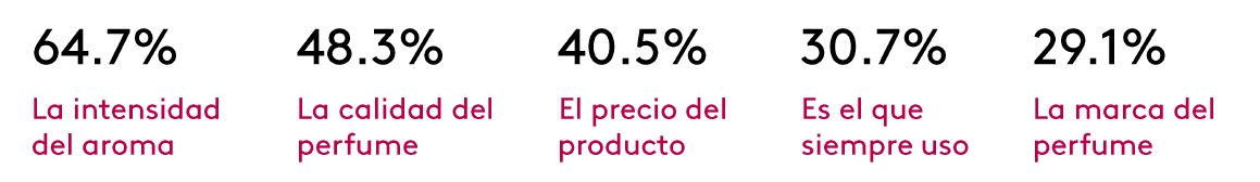 Por lo tanto, identificar las motivaciones para consumir un producto es fundamental. En el caso de Fragancias la principal razón para elegir una marca es por la intensidad del aroma, con 65%. Calidad y precio serían los otros dos aspectos a considerar para su compra.
