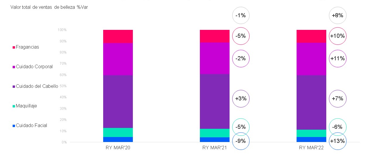 En México, los productos de Cuidado del cabello fueron los únicos que aumentaron sus ventas durante el confinamiento y en 2022 continúa presentando aumentos moderados, a pesar de estar por detrás de Fragancias, Cuidado Corporal y Facial que crecieron a doble digito.