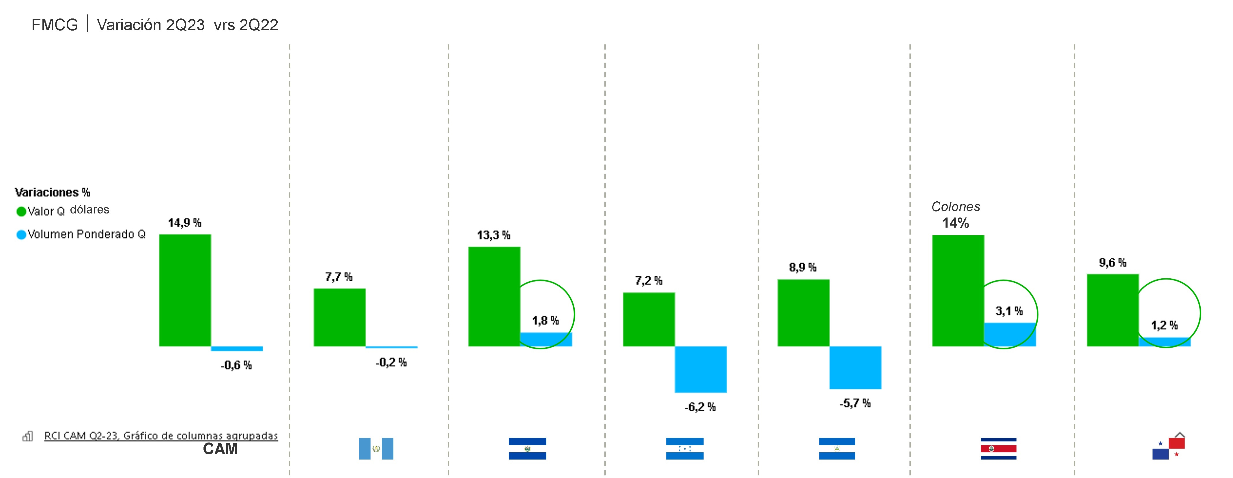 En cuanto a las Marcas Privadas, desde el primer trimestre del año se veía un buen desempeño y este hábito de compra continua para el segundo trimestre, donde se suman las Marcas económicas. Éstas representan casi el 51% del gasto en volumen dentro de la canasta de productos de consumo masivo, sin embargo, en Honduras y Guatemala ellas no presentan crecimiento de éstas. Ya las Marcas Privadas se desarrollan sobre todo en Costa Rica, Guatemala y El Salvador.