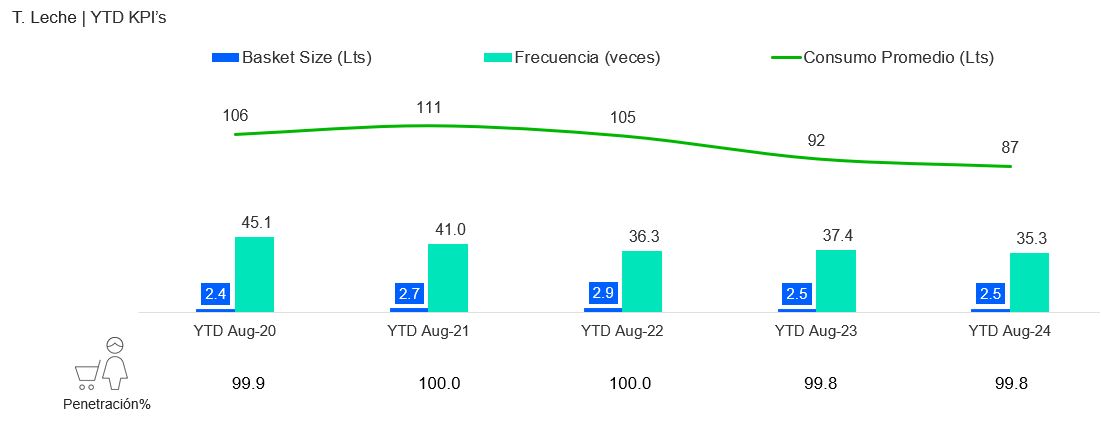 Durante el período de enero a agosto del 2020, el consumo promedio de leche por hogar fue de 106 litros, en contraste con los 87 litros registrados en el mismo período del 2024. Asimismo, la frecuencia de compra por hogar disminuyó considerablemente de 45.1 veces en promedio a 35.3 veces en el lapso de cinco años, lo que significa que en el 2020 un hogar compraba leche cada 5 días aproximadamente, mientras que en este 2024 lo hace una vez por semana.