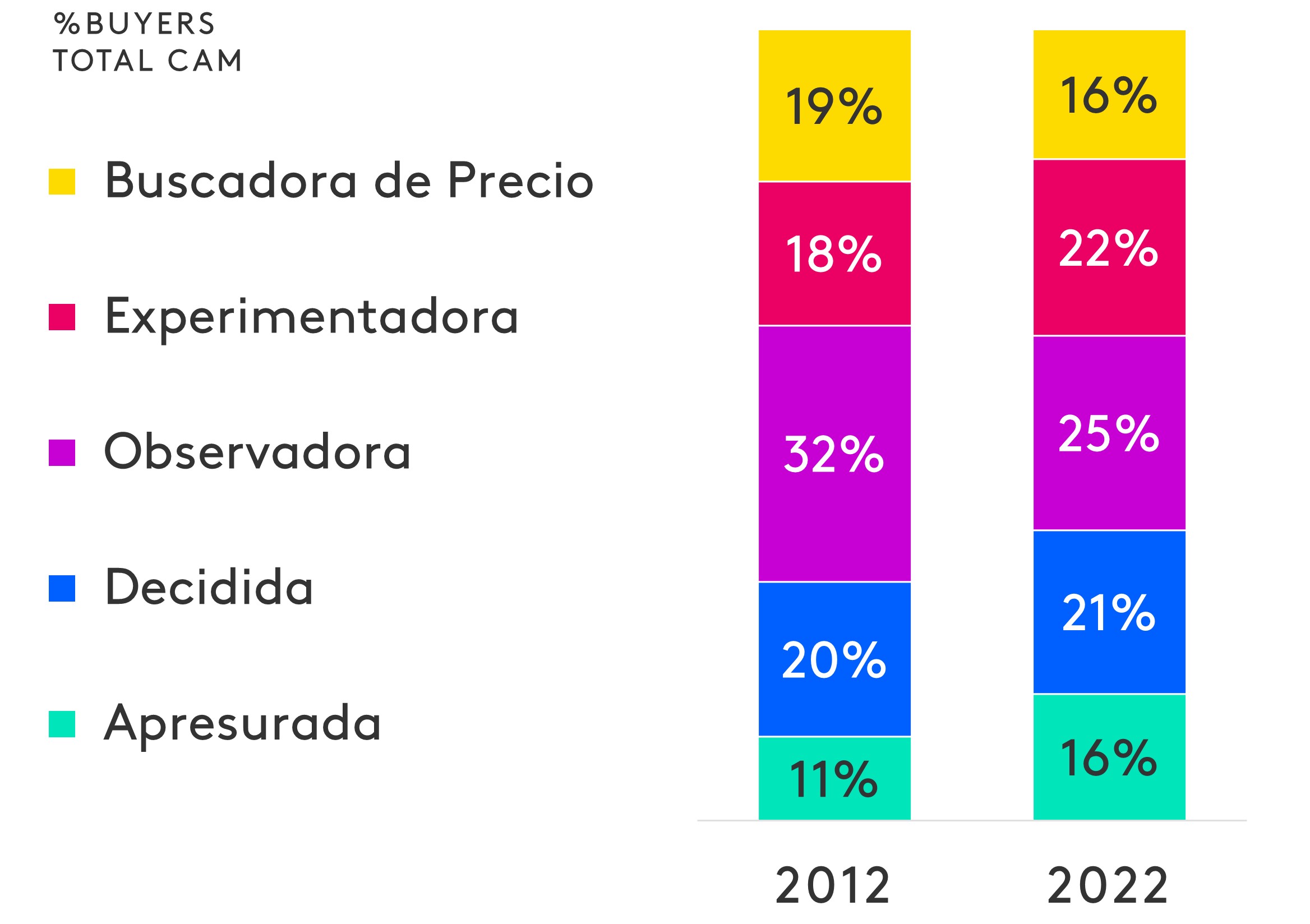 Y aunque el mayor porcentaje de mujeres son compradoras observadoras, estas se redujeron en comparación con el 2012, influenciado por temas de pandemia ya que las observadoras se caracterizan en que les gusta caminar por las tiendas y analizar, evaluar lo que están comprando.